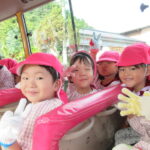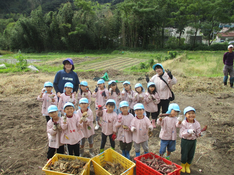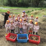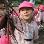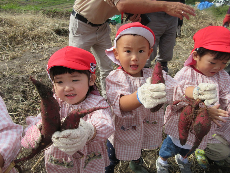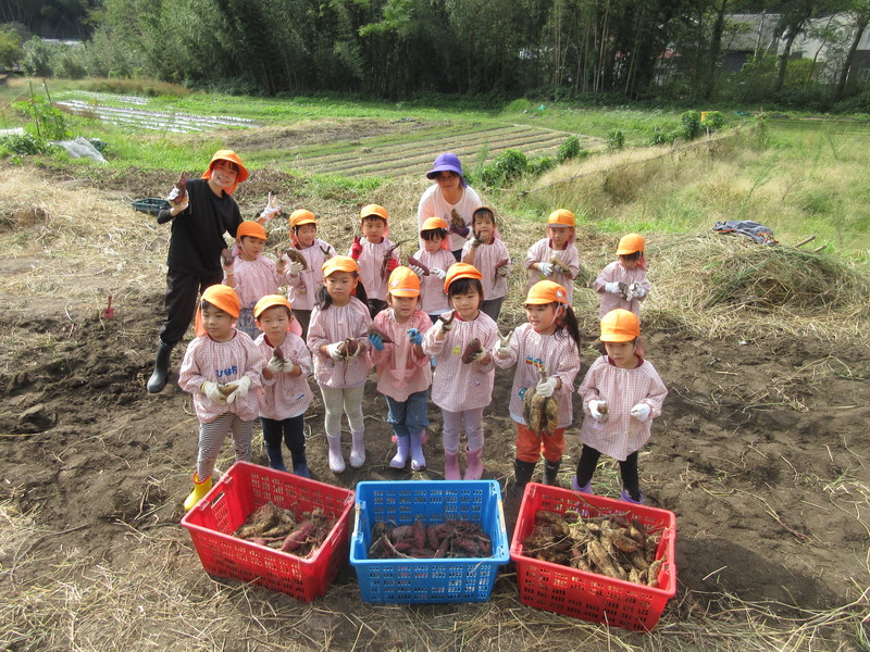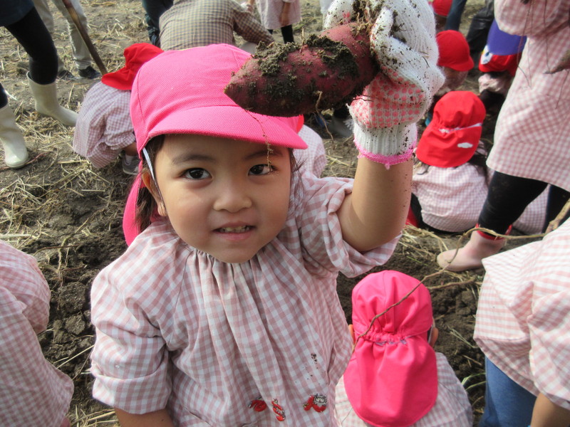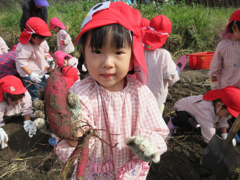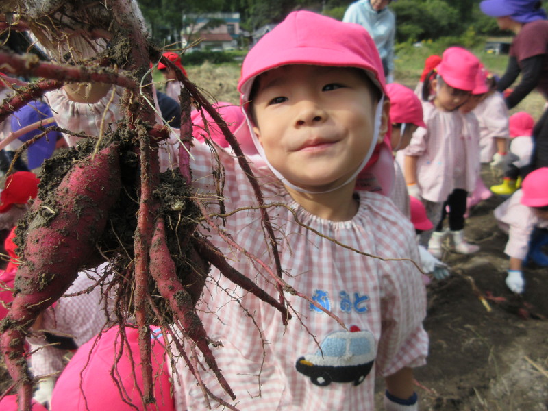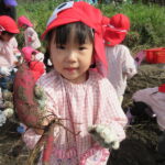 紫の芋と白い芋2種類のお芋を掘って、大きな芋が採れると大喜びの子どもたちでした。
